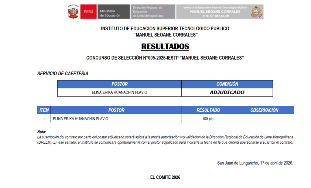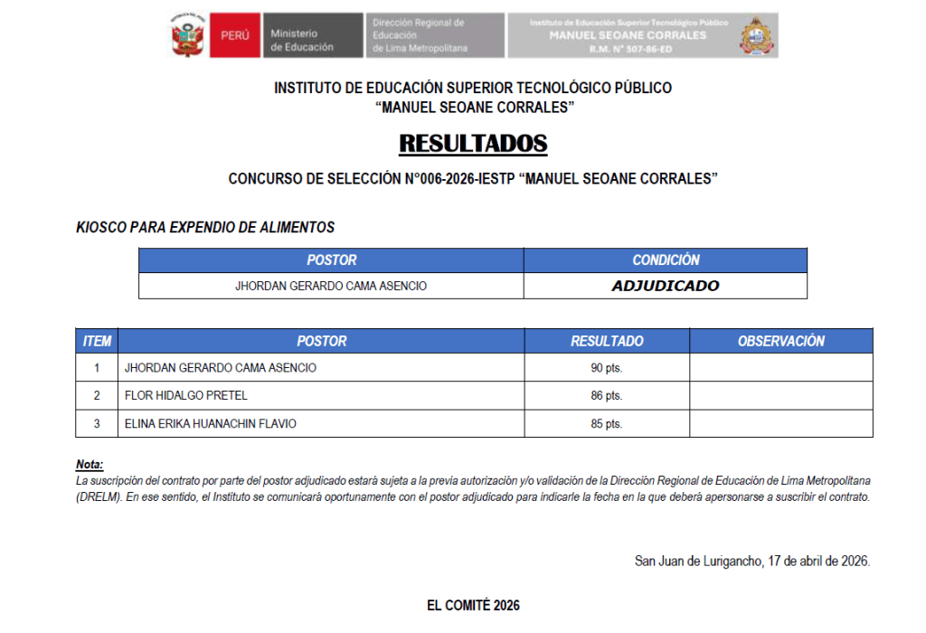 Se publicaron los resultados del Concurso de Selección N.º 006-2026 del IESTP “Manuel Seoane Corrales” para el kiosco de expendio de alimentos y cafetería.