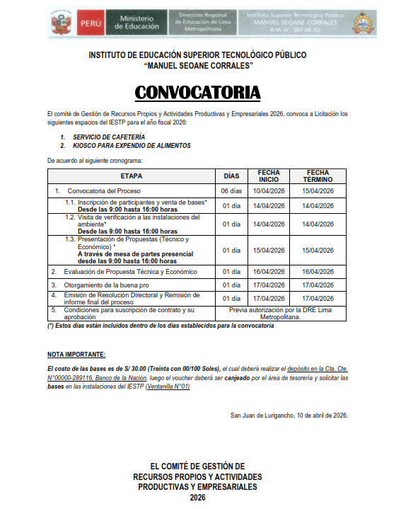 Convocatoria oficial del Instituto de Educación Superior Tecnológico Público “Manuel Seoane Corrales” para la concesión de servicios de cafetería y kiosco de alimentos correspondiente al año fiscal 2026. Incluye el cronograma del proceso, requisitos y detalles para la adquisición de bases y participación de los interesados.